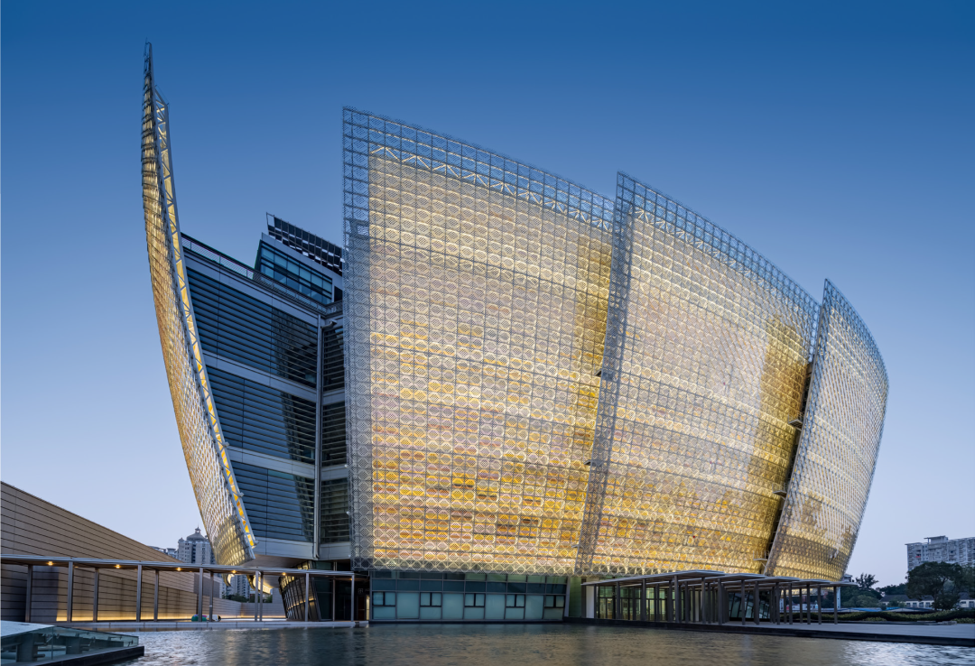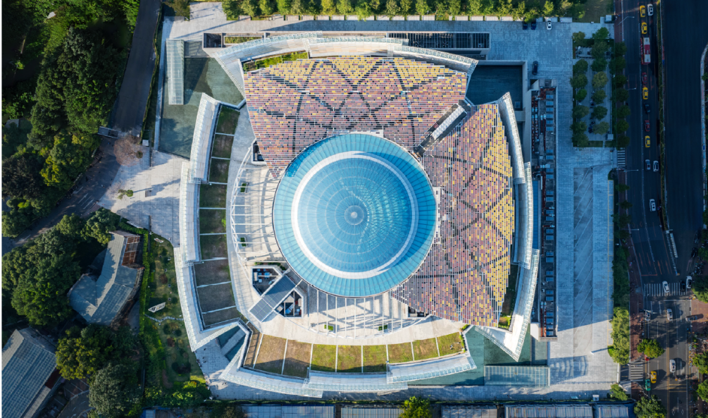 托马斯·赫尔佐格教授将建筑构想为“于水上绽放的英雄花”和“晶莹剔透的瓷器”,深刻体现了岭南建筑的文化特质。将碲化镉玻璃与铝板组合成花瓣形态,隐喻美术馆作为“艺术容器”的概念。屋顶部分则采用彩色碲化镉光伏玻璃,从高空俯瞰时形成独特的“第五立面”,既呼应了岭南瓷器的晶莹质感,又通过现代材料重新诠释了传统美学。