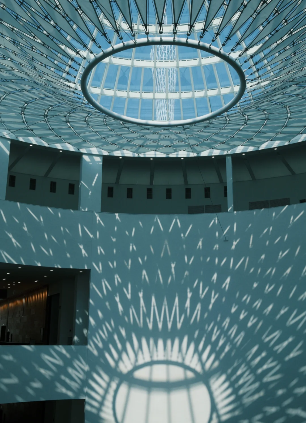 美术馆的主立面采用双层复合幕墙体系,外层由12组碲化镉光伏发电玻璃组成,内层搭配多彩铝板。这种设计不仅实现了能源自给,更让建筑表皮随着阳光角度变化呈现出微妙的色彩渐变。清晨,玻璃幕墙透出柔和的金色光晕;正午时,它折射出冷调的银灰色;傍晚则泛起暖橙色的微光,仿佛一件巨大的“光之艺术品”。