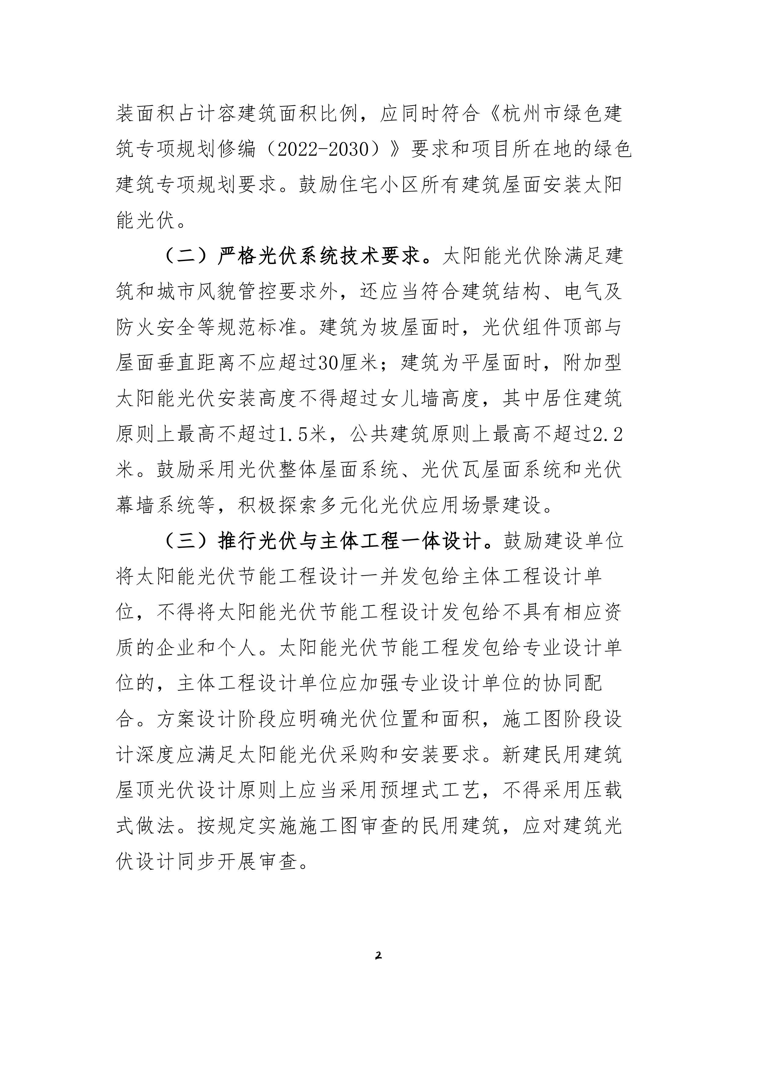 新建民用建筑(不含农民自建房)应当按照建筑可再生能源有关标准要求,同步设计、安装太阳能光伏。居住建筑、公共建筑光伏组件安装面积占计容建筑面积比例,应同时符合《杭州市绿色建筑专项规划修编(2022-2030)》要求和项目所在地的绿色建筑专项规划要求。鼓励住宅小区所有建筑屋面安装太阳能光伏。