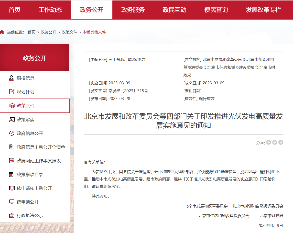 北京市发改委《关于印发推进光伏发电高质量发展实施意见的通知》:“光伏发电项目建设应满足所在区域生态环境、城市风貌、第五立面管控等相关要求,项目外观、色彩应与建筑主体及周边环境相融合。”特别值得注意的是,该文件对屋顶光伏设施高度提出具体限制,要求对于超出既有建筑女儿墙高度的光伏发电组件应采用隐蔽设计,避免对周边建筑及环境造成影响。
