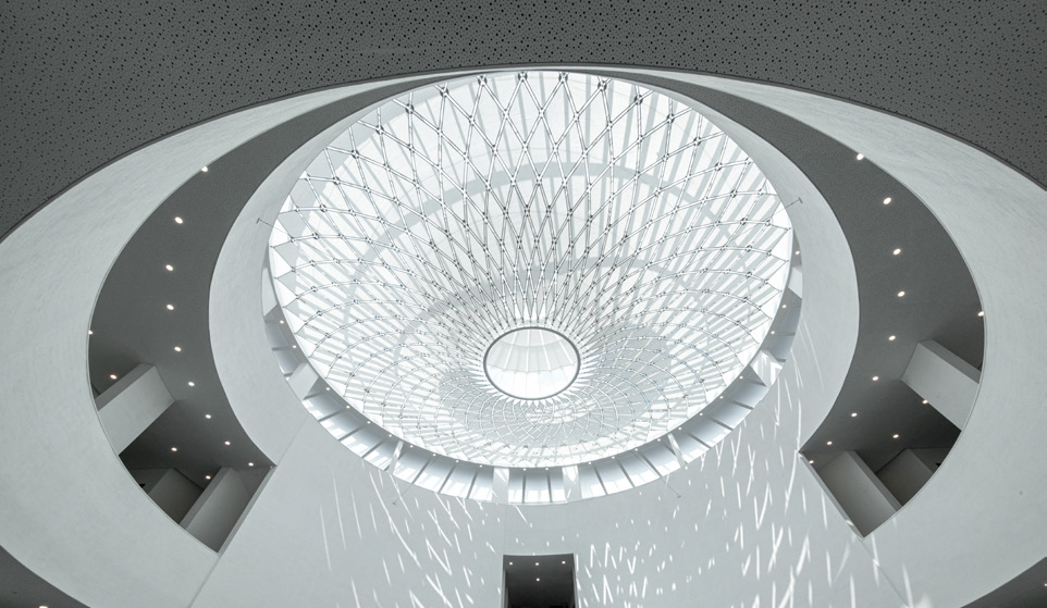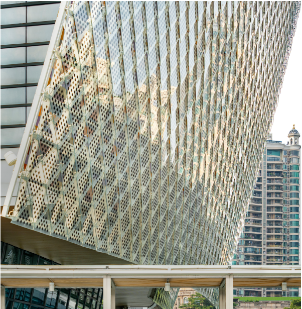 托马斯·赫尔佐格教授将建筑构想为“于水上绽放的英雄花”和“晶莹剔透的瓷器”,深刻体现了岭南建筑的文化特质。将碲化镉玻璃与铝板组合成花瓣形态,隐喻美术馆作为“艺术容器”的概念。屋顶部分则采用彩色碲化镉光伏玻璃,从高空俯瞰时形成独特的“第五立面”,既呼应了岭南瓷器的晶莹质感,又通过现代材料重新诠释了传统美学。