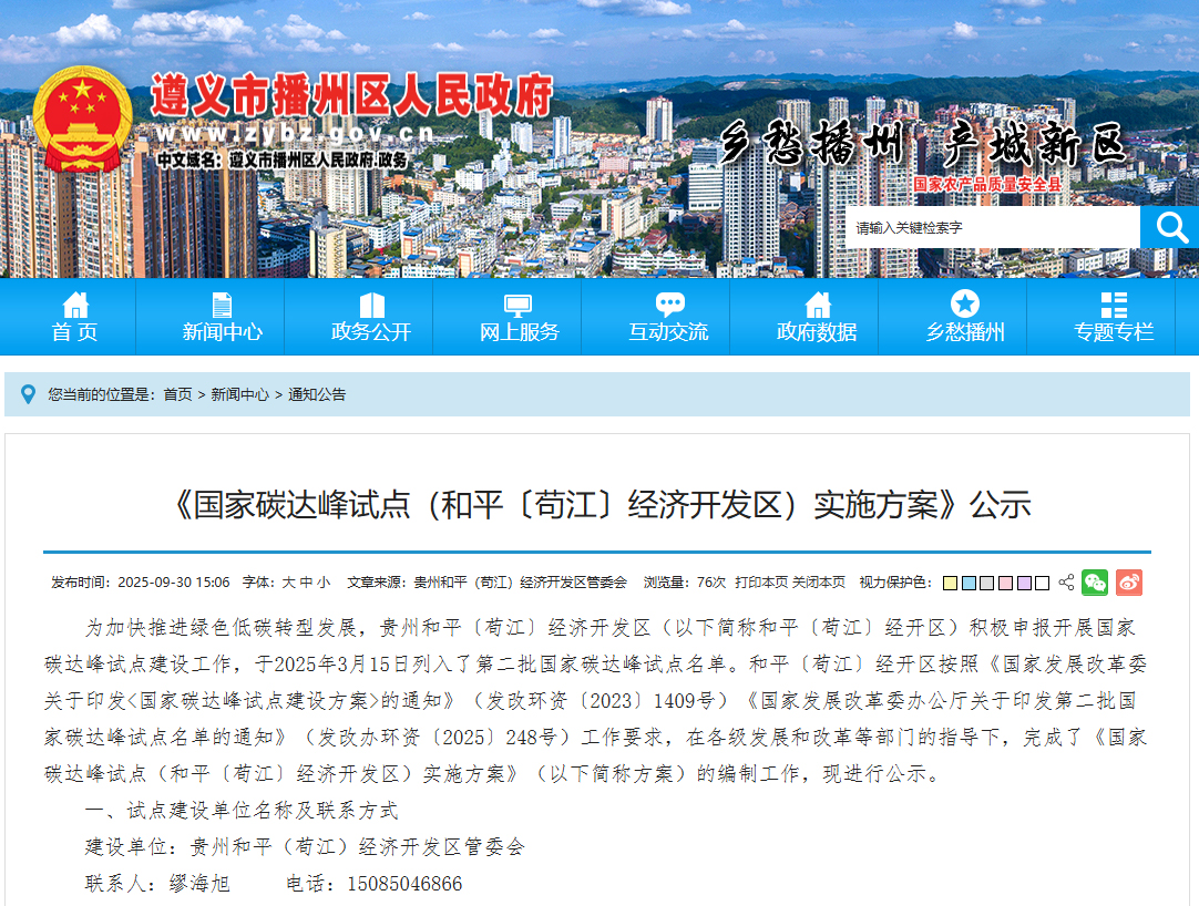 近日,贵州和平(苟江)经济开发区管理委员会正式公示了《国家碳达峰试点(和平〔苟江〕经济开发区)实施方案》(以下简称《方案》),向社会公开征求意见。该《方案》的制定,标志着这一于2025年3月入选第二批国家碳达峰试点名单的经开区,进入了全面推动绿色低碳转型的实质性建设阶段。