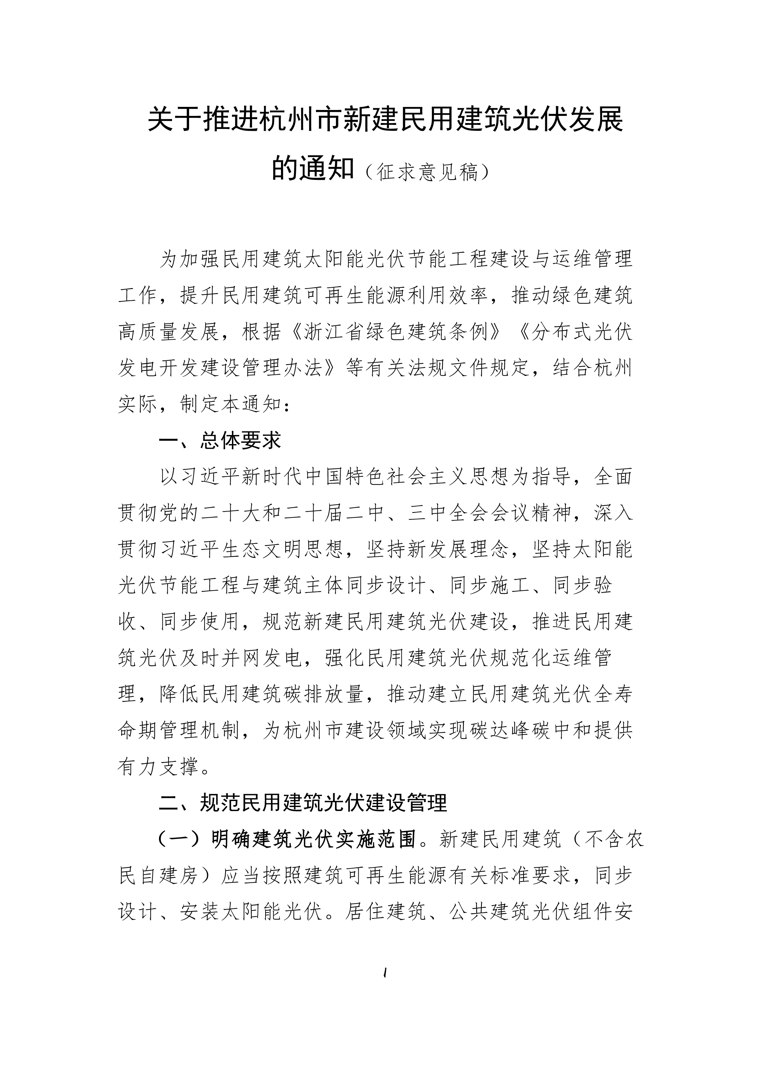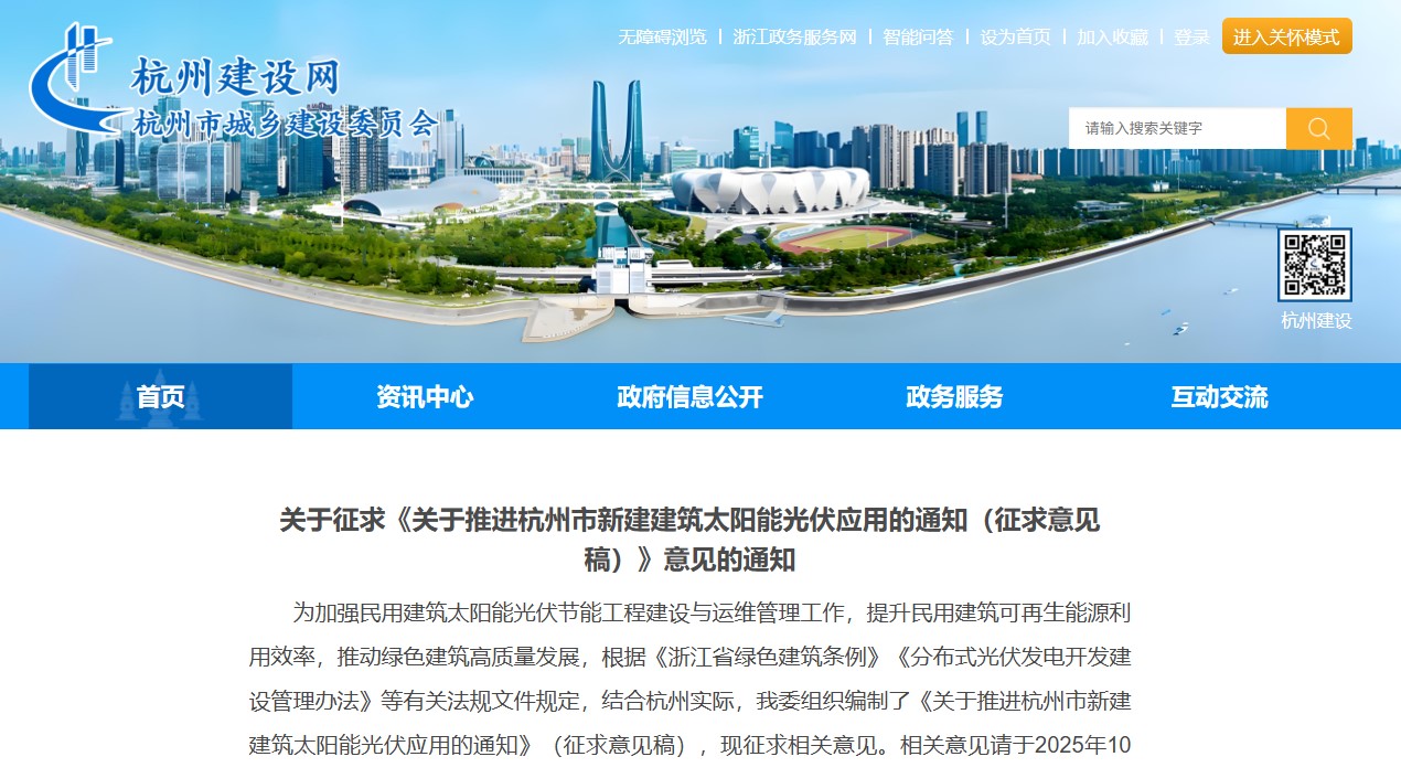 10月23日,杭州市城乡建设委员会为规范民用建筑光伏建设管理,发布了《关于推进杭州市新建民用建筑光伏发展的通知(征求意见稿)》,并面向社会公开征求意见。