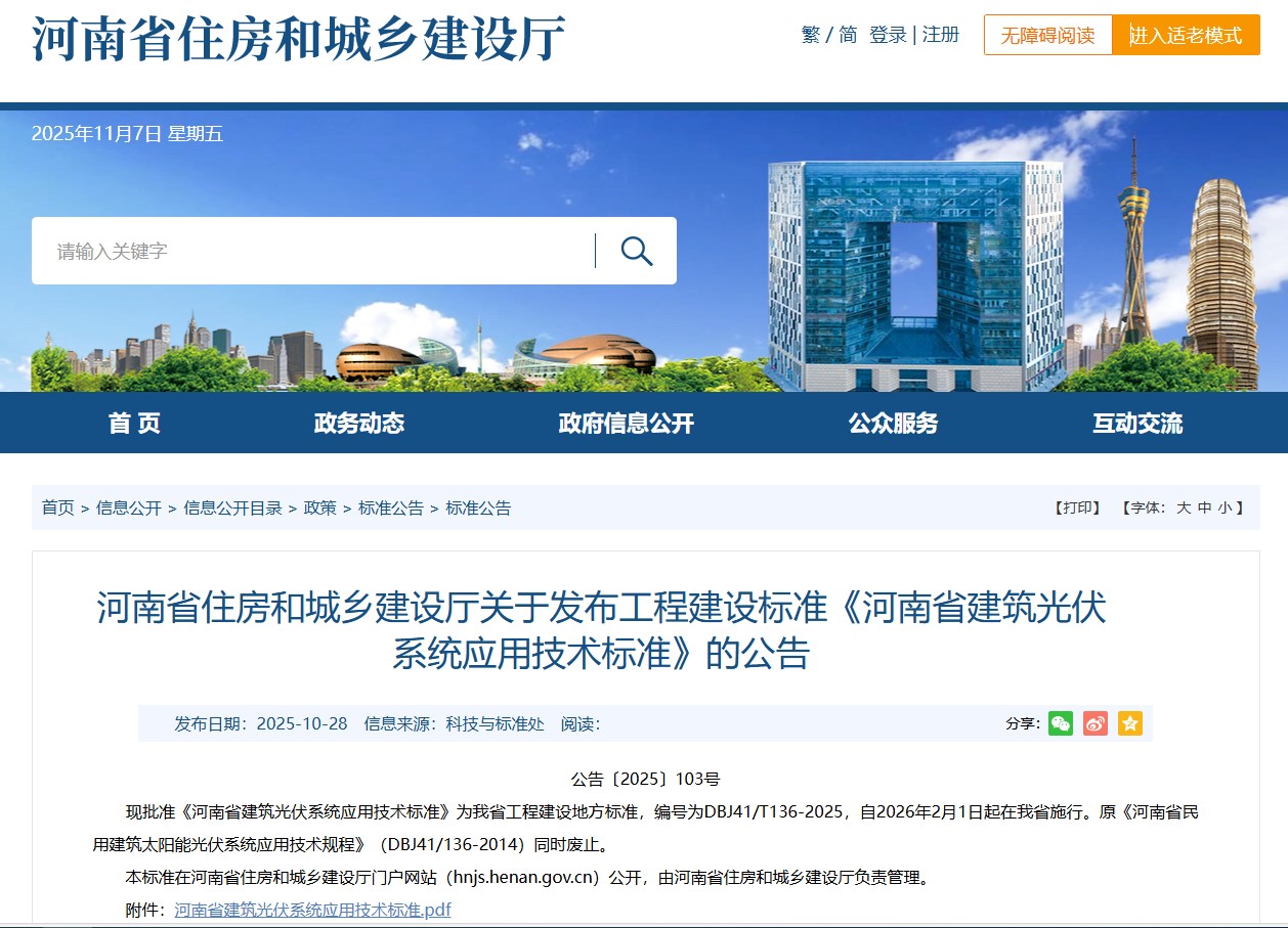 根据我省工程建设地方标准编制计划,河南省住房和城乡建设厅组织修订的《河南省建筑光伏系统应用技术标准》已经审定通过,自2026年2月1日起施行。